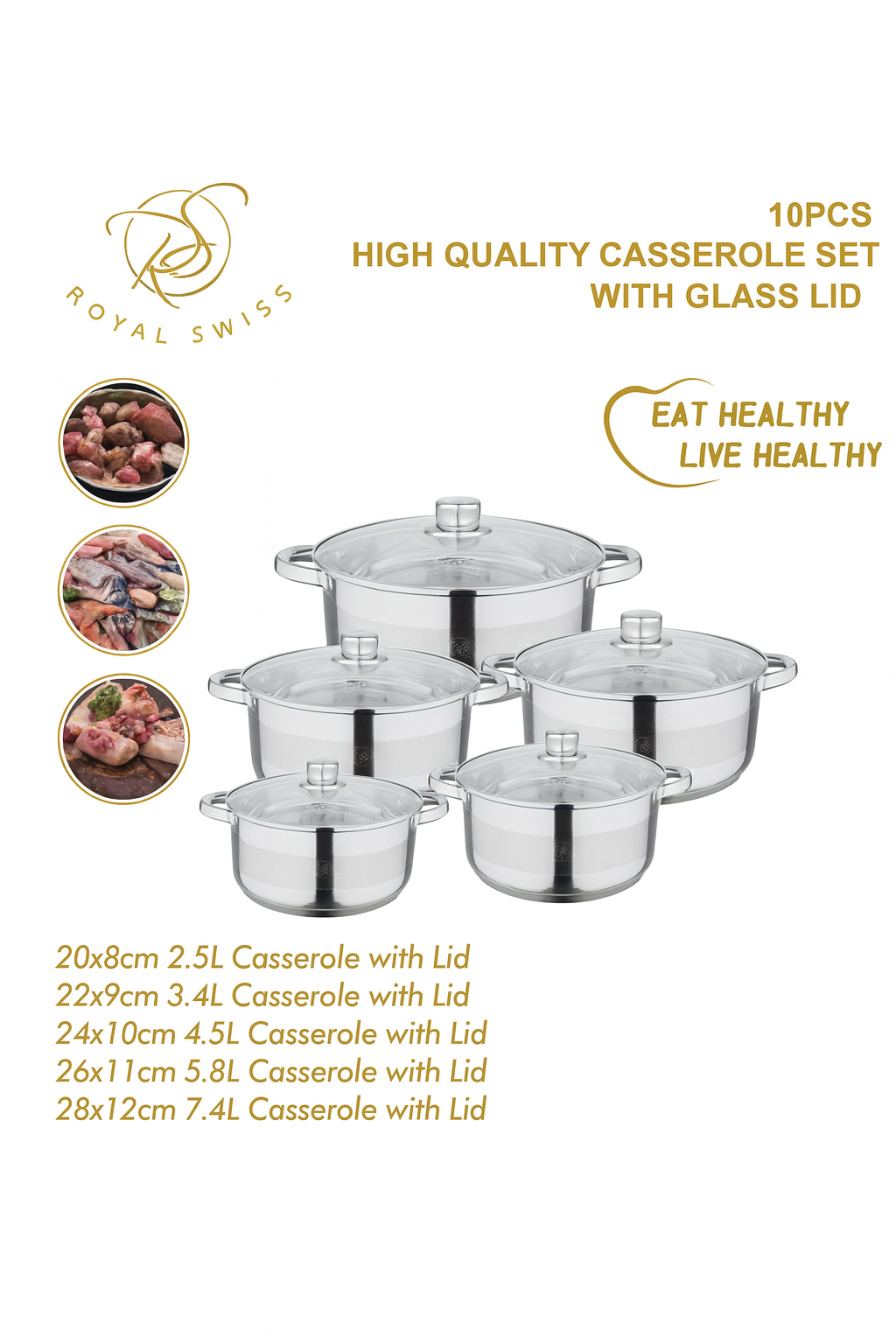 Juego de Cacerolas Royal Swiss de 10 piezas con tapas de vidrio.