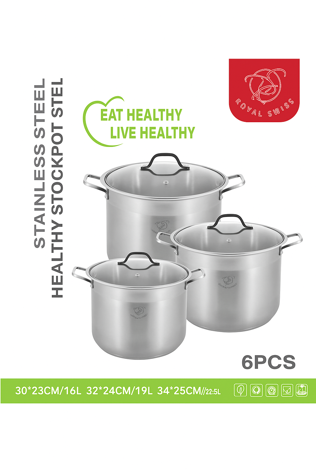 Descubre la excelencia culinaria con el Juego de Ollas Royal Swiss de Acero Inoxidable. Diseñado para ofrecer durabilidad, elegancia y un rendimiento superior, este set incluye tres ollas de gran capacidad ideales para sopas, guisos y comidas familiares. Fabricadas en acero inoxidable de alta calidad, distribuyen el calor de manera uniforme y conservan el sabor natural de los alimentos. Aptas para todo tipo de cocinas y fáciles de limpiar.