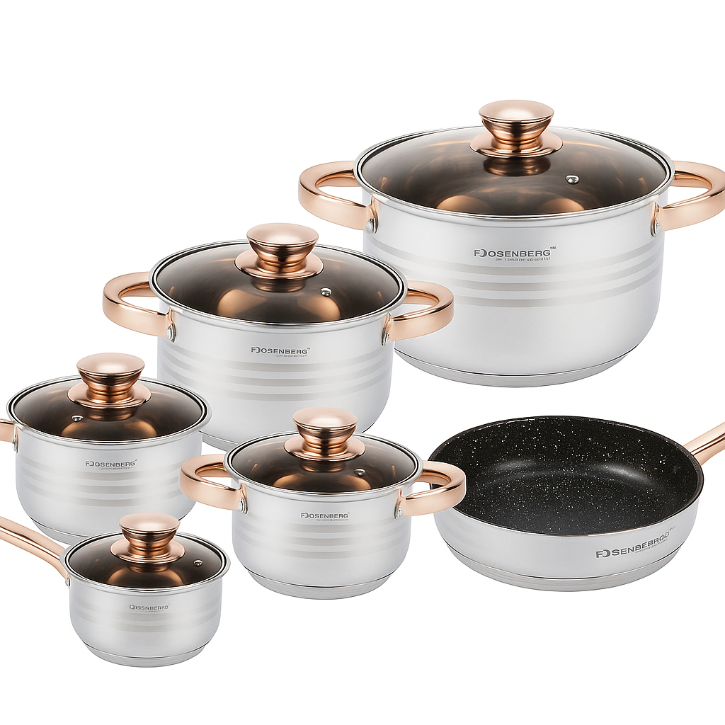 Dale un toque elegante y profesional a tu cocina con este exclusivo set de ollas y sartenes de acero inoxidable Fosenberg.