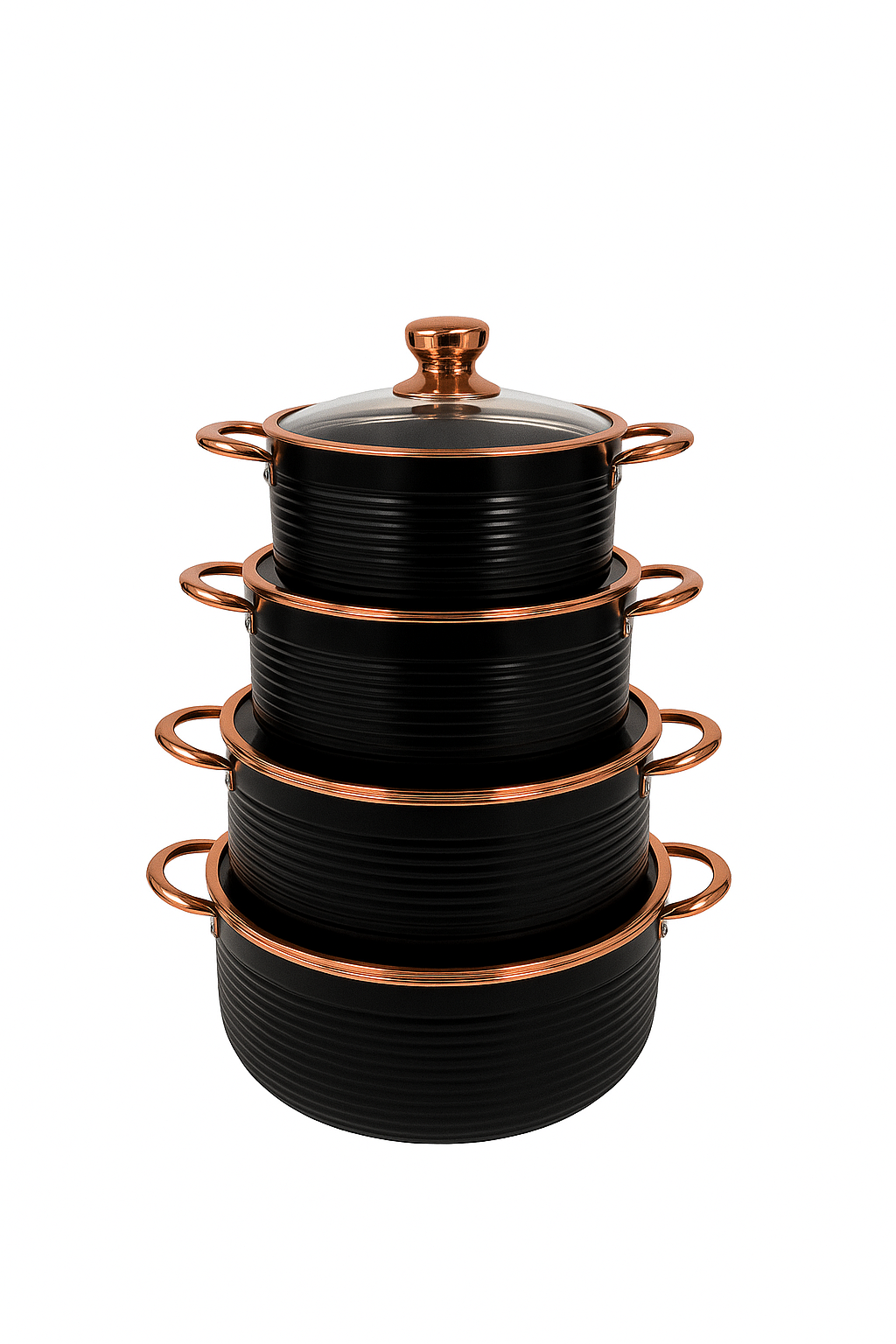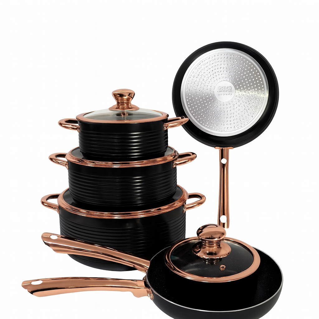 Eleva tu experiencia en la cocina con nuestro exclusivo juego de ollas y sartenes negras con mango dorado. Diseñado para chefs apasionados y amantes del estilo, cada pieza combina elegancia, funcionalidad y durabilidad.