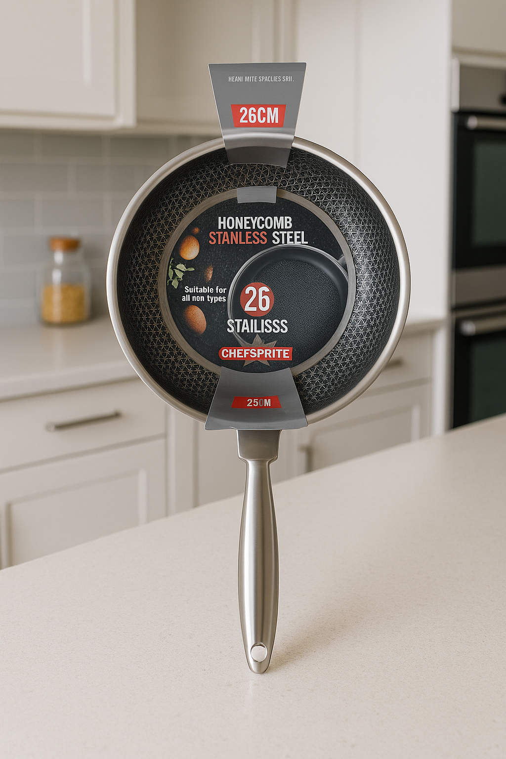 Fabricada en acero inoxidable de alta calidad (26 cm) con diseño de panal que distribuye el calor de forma uniforme, evita que los alimentos se peguen y garantiza una cocción rápida y saludable.